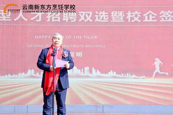 罗校长致开幕辞称,云南新东方烹饪学校以全国职业教育大会精神为指引,践行技能让生活更加美好的目标,以培养实用性、技能型人才为己任,以技能提升为抓手,以市场需求为导向,保证学生学有所成。